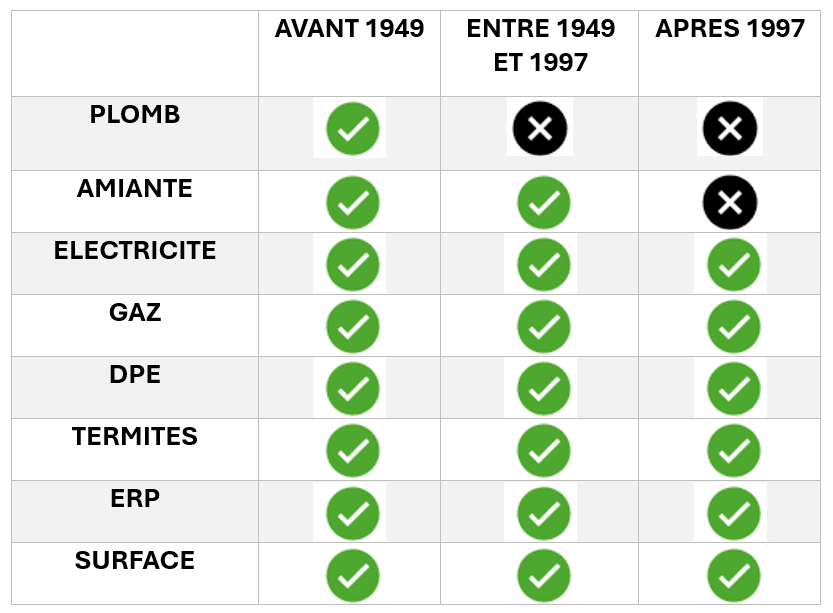 Aidez vous du tableau pour connaître les diagnostics qui concernent votre bien, nous sommes là si besoin.